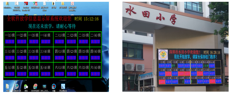 本系統把放學引導功能嵌入到學校原有LED顯示屏顯示功能中,使LED顯示屏功能更豐富、實用; 學校校門的LED顯示屏在其他時間可以象常規LED顯示屏一樣正常使用,當到放學時,系統自動定時進入放學引導功能狀態,通過系統配置的平板電腦,在無線的狀態下控制LED顯示屏上各個班級的放學狀態顯示,發布即時通告信息,系統還可通過顯示屏配備的戶外音箱同步播報即時班級放學狀態,使得校門的班級放學引導的效果更直觀明顯;通過手持平板電腦在界面點擊班級放學狀態,實時的同步更改LED大屏的班級放學狀態,操作簡單,使用快捷; 放學引導系統的LED顯示屏顯示版面設計為開放式的,可編輯顯示學校LOGO,當前時間,即時文字公告等,每個年級班級的顯示位置、顯示字體、顏色均可根據需要自由設定,確保突出學校特色; LED顯示屏作為放學引導系統使用時,必須滿足三個條件:一必須是全彩LED顯示屏、二是顯示屏控制系統必須是同步顯示屏控制系統、三是校門處必須有WIFI信號可接入校園網,具備以上條件,使用一臺手持平板電腦,通過本軟件系統即可把放學引導功能嵌入到LED顯示屏使用功能中。